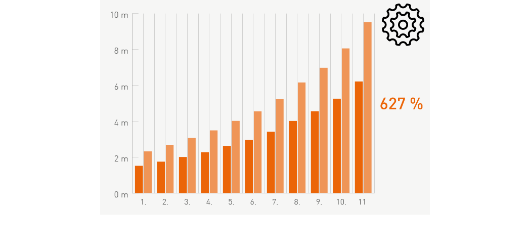 Im Konfigurator findest du an jeder Schaltung ein Diagramm mit den Entfaltungen. Dort werden pro Gang die Meter angezeigt, die du in diesem Gang mit einer Kurbelumdrehung zurücklegst.